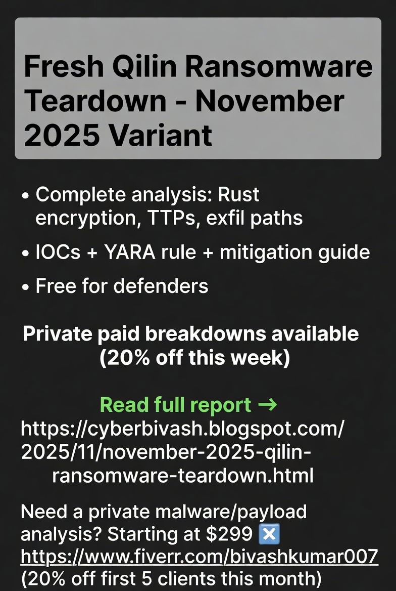 YARA Rule (tested on 30+ Qilin samples)rule Qilin_RustVariant_2025 { meta: author = "CyberDudeBivash Labs" date = "2025-11-20" description = "Detects Qilin ransomware Rust binaries" strings: $s1 = ".qilin" ascii wide $s2 = "Your files are encrypted" ascii $s3 = "qilinpay[.]onion" ascii $rust_sig = { 72 65 6C 6C 6F 20 57 6F 72 6C 64 } // Rust string marker condition: uint16(0) == 0x7F45 and all of them // ELF header for cross-platform}